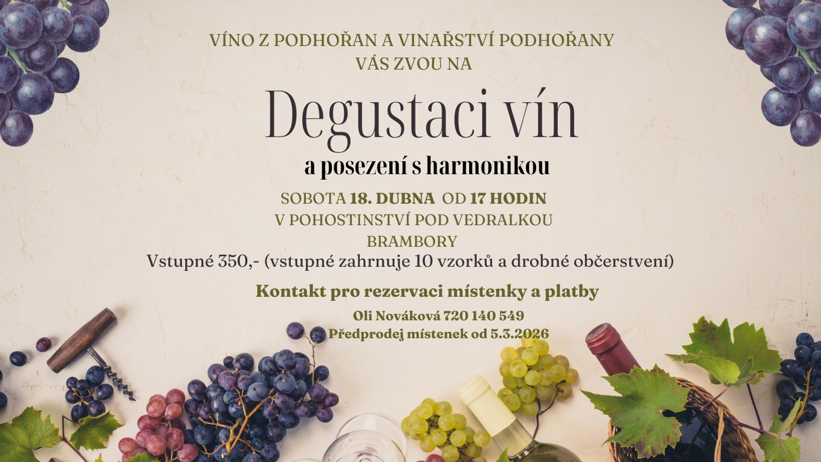 Zveme vás na jedinečnou degustaci vín, která se uskuteční v sobotu 18. dubna od 17 hodin v Pohostinství pod Vedralkou v Bramborách. Během akce si budete moci vychutnat 10 vzorků vín a drobné občerstvení. K poslechu zahraje harmonikář, což přispěje k příjemné atmosféře. Nezapomeňte si rezervovat místenku, předprodej začíná 5. března.
